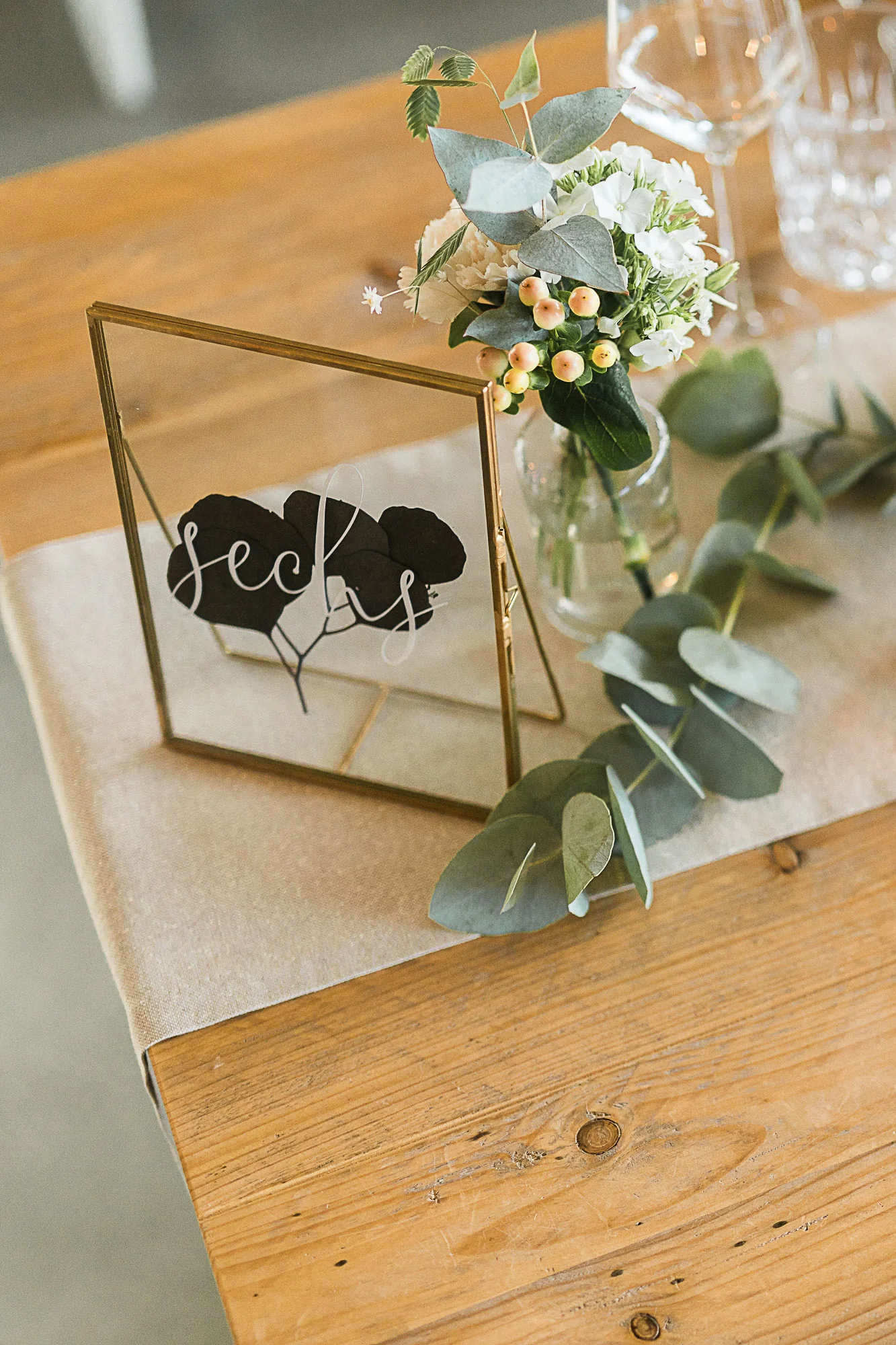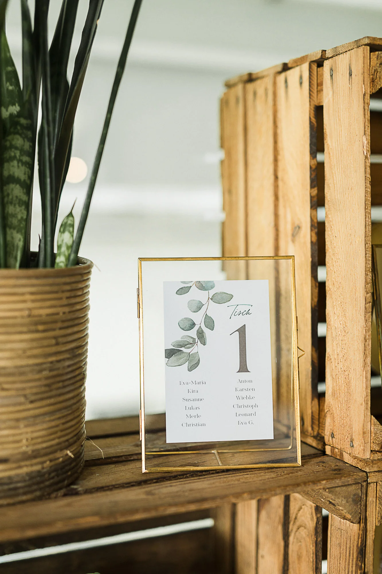 Bella kann mit einer schlichten Tischnummer gemietet werden – oder ganz pur, damit ihr eure eigene Papeterie einsetzen könnt. Das Eukalyptusblatt ist nicht inklusive.