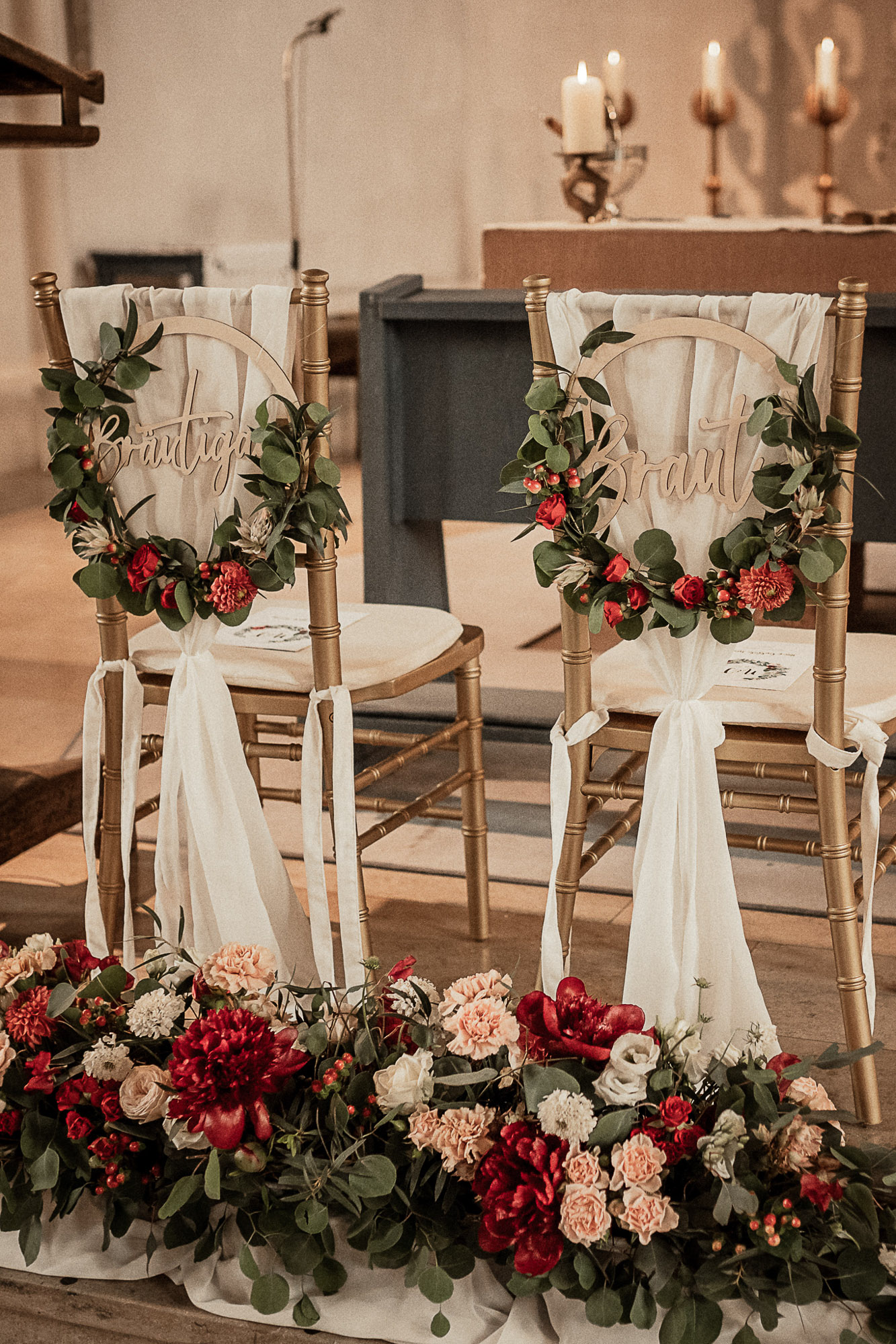 Zwei Stuhlanhänger mit der Aufschrift Braut und Bräutigam – ein liebevolles Detail für euer Trausetting oder die Dinnertafel.