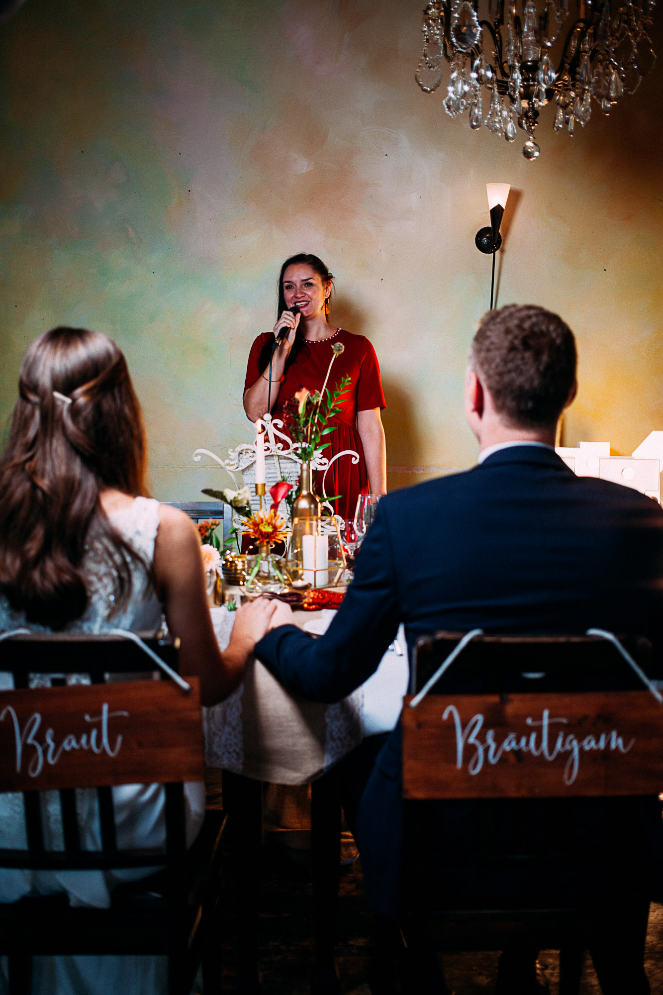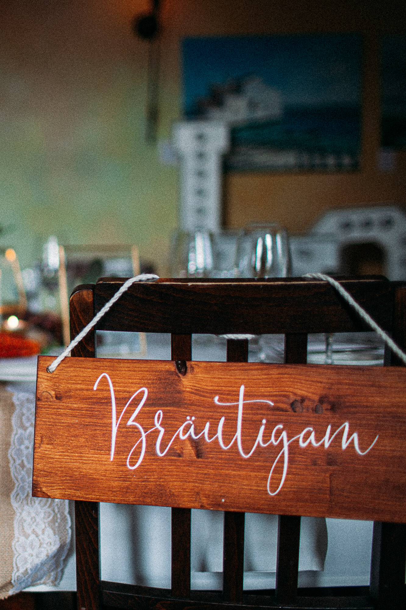 Zwei Stuhlanhänger mit der Aufschrift Braut und Bräutigam – ein liebevolles Detail für euer Trausetting oder die Dinnertafel.