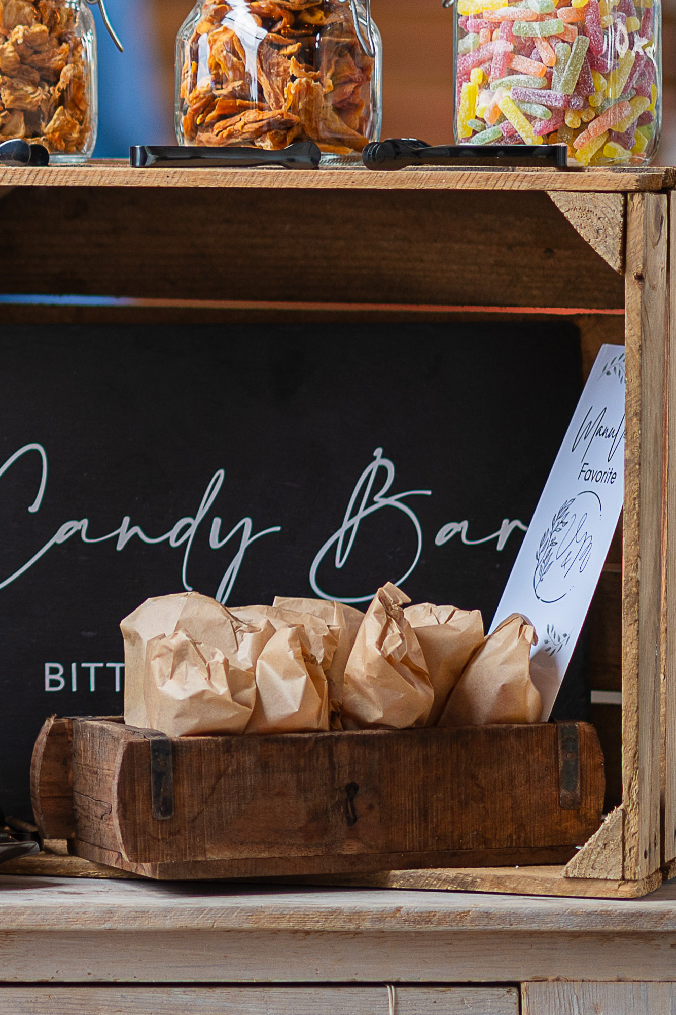 Die Vintage-Ziegelkisten sind alle ein wenig unterschiedlich. Sie bringen Charakter auf jede Festtafel und lassen sich unglaublich vielseitig einsetzen. Als Teil der Naschbar macht sie eine tolle Figur: zum Beispiel mit verpackter Schokolade gefüllt oder umgedreht als kleine Bühne für Gläser und Deko.